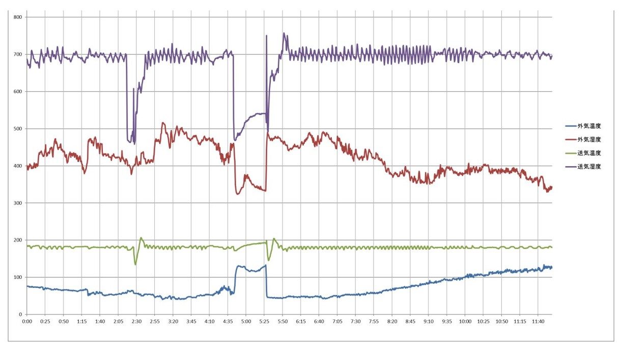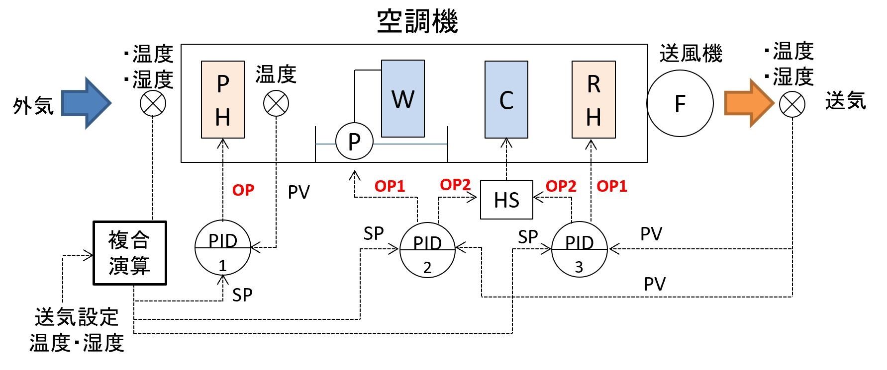 一般的な空調機の制御入力は2種類のヒーターと1種類のクーラー、1種類の加湿器の計4つとなっており、マルチループ式のPID制御によってコントロールを行います。